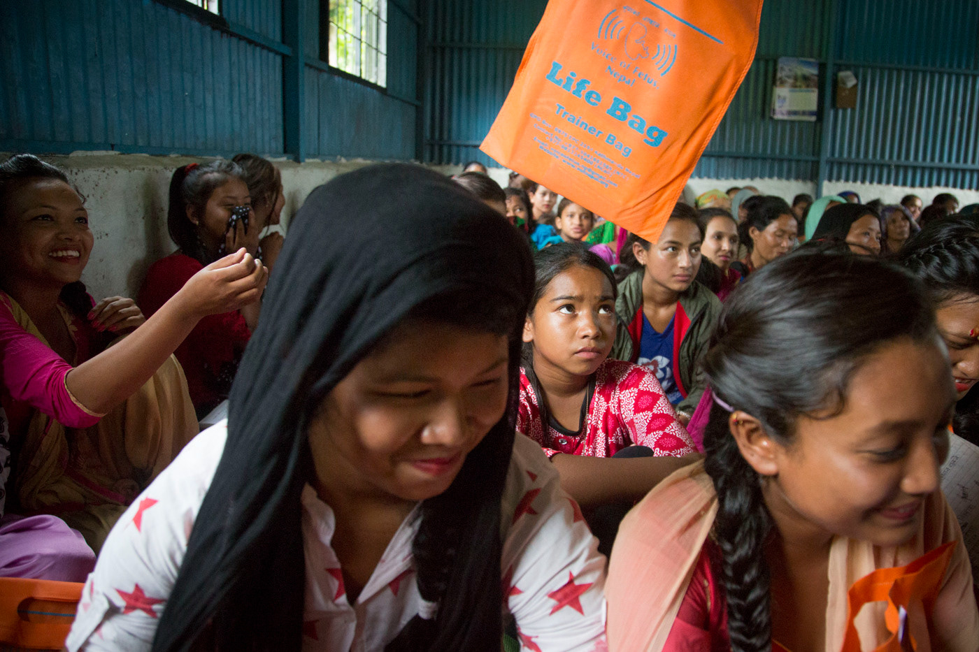 Soman Rai, a pastor who founded the non-profit Voice of Fetus Nepal, and his volunteers pass out Life Bags after his lecture about why women shouldn't have abortions because it is killing a fetus, at a small church in the village of Shilaprabat, Sindhupalcholk district, Nepal, July 14, 2017. (Photo Credit/Tara Todras-Whitehill/European Journalism Centre/Vignette Interactive)