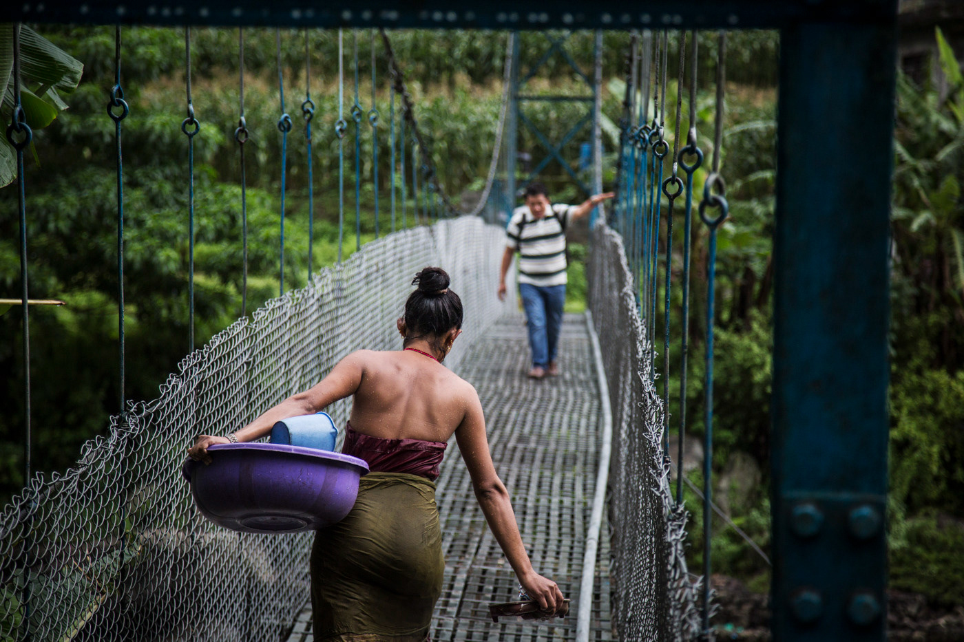 Pastor Soman Rai, right, who founded the non-profit Voice of Fetus Nepal, walks over a wire bridge after his lecture about why women shouldn't have abortions because it is killing a fetus, at a small church in the village of Shilaprabat, Sindhupalcholk district, Nepal, July 14, 2017. (Photo Credit/Tara Todras-Whitehill/European Journalism Centre/Vignette Interactive)