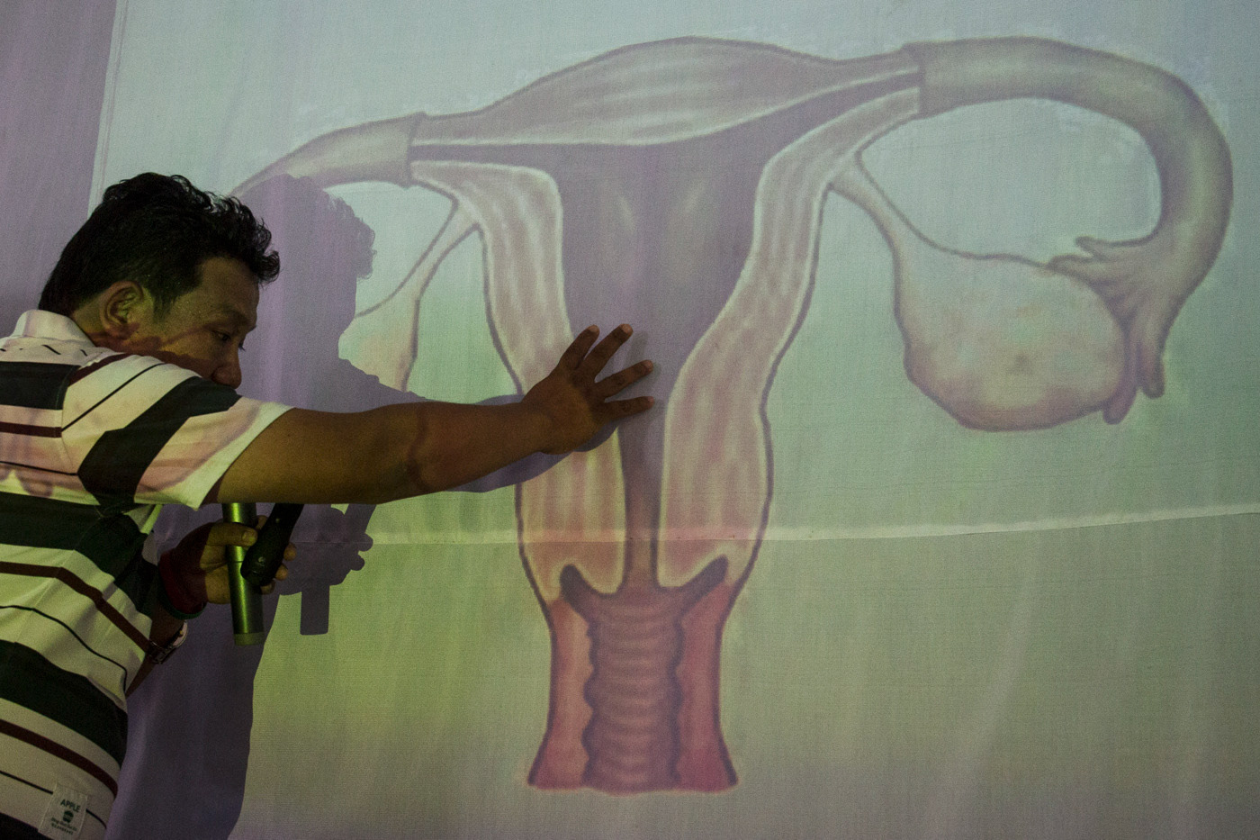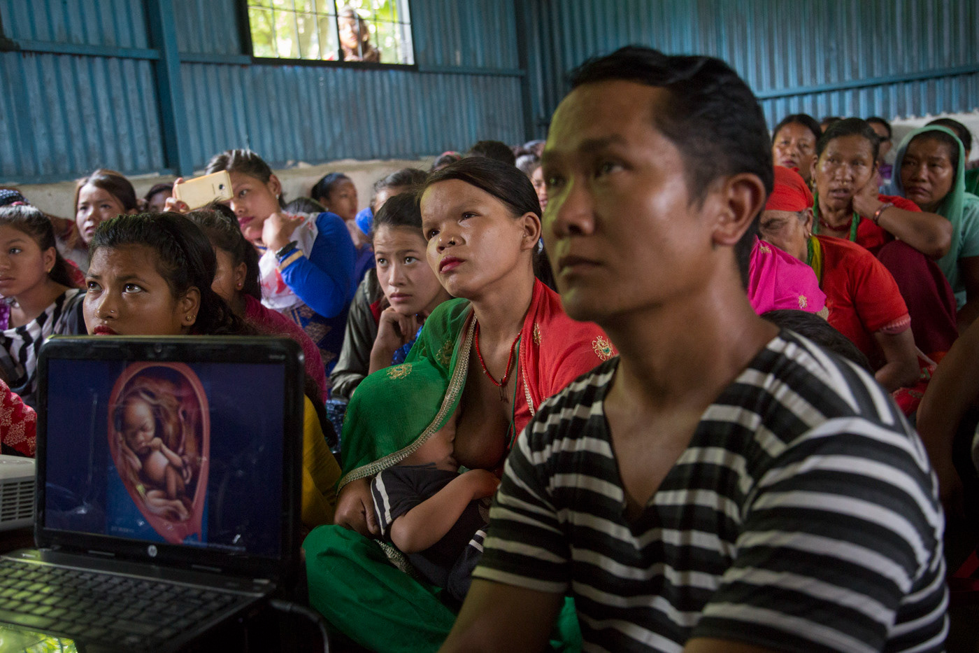 Soman Rai, not seen, a pastor who founded the non-profit Voice of Fetus Nepal, gives a presentation about abstinence, falling in love and why women shouldn't have abortions because it is killing a fetus, at the Shree Kalinchwok secondary school in Dolakha, Nepal, July 17, 2017. (Photo Credit/Tara Todras-Whitehill/European Journalism Centre/Vignette Interactive)