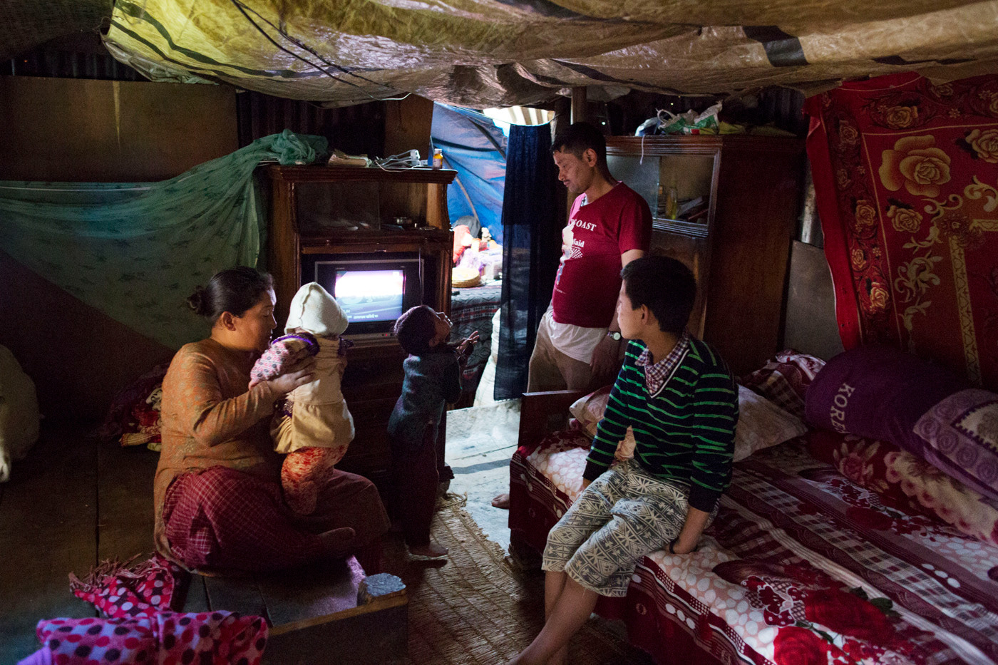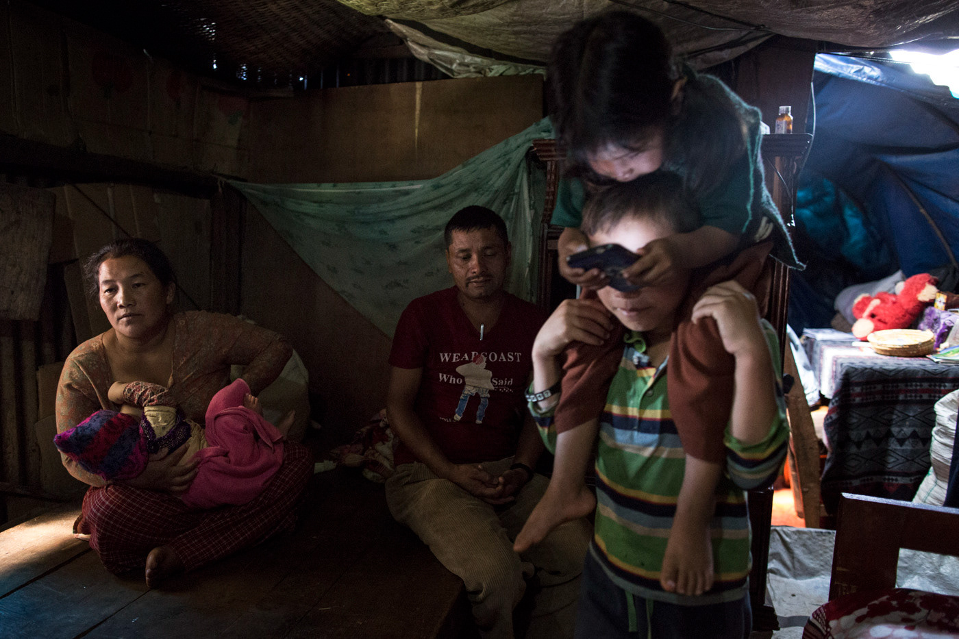 Reshu Thami, left, age 38, nurses her youngest of eight children, Esther, age 6 months, while her son Sippro, age 6, right, gives a piggy back ride to her daughter Sofiya, age 3, as her husband Ranjan, age 40 ,sits inside their small shack in Dolakha, Nepal, July 16, 2017. (Photo Credit/Tara Todras-Whitehill/European Journalism Centre/Vignette Interactive)