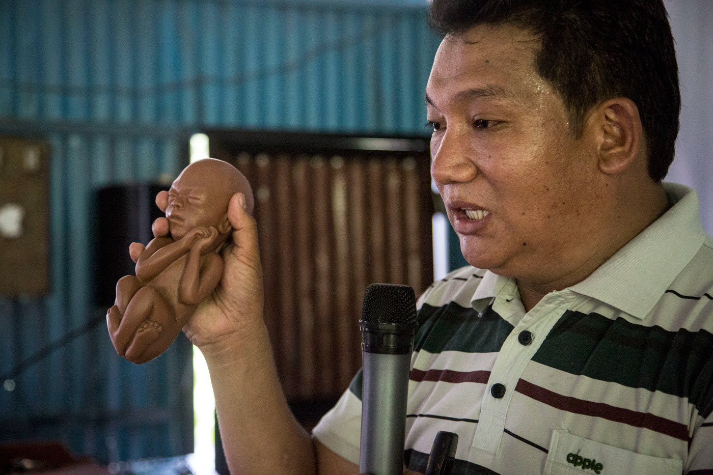 Soman Rai, a pastor who founded the non-profit Voice of Fetus Nepal, holds up a model of a fetus during a presentation about why women shouldn't have abortions because it is killing a fetus, at a small church in the village of Shilaprabat, Sindhupalcholk district, Nepal, July 14, 2017. (Photo Credit/Tara Todras-Whitehill/European Journalism Centre/Vignette Interactive)