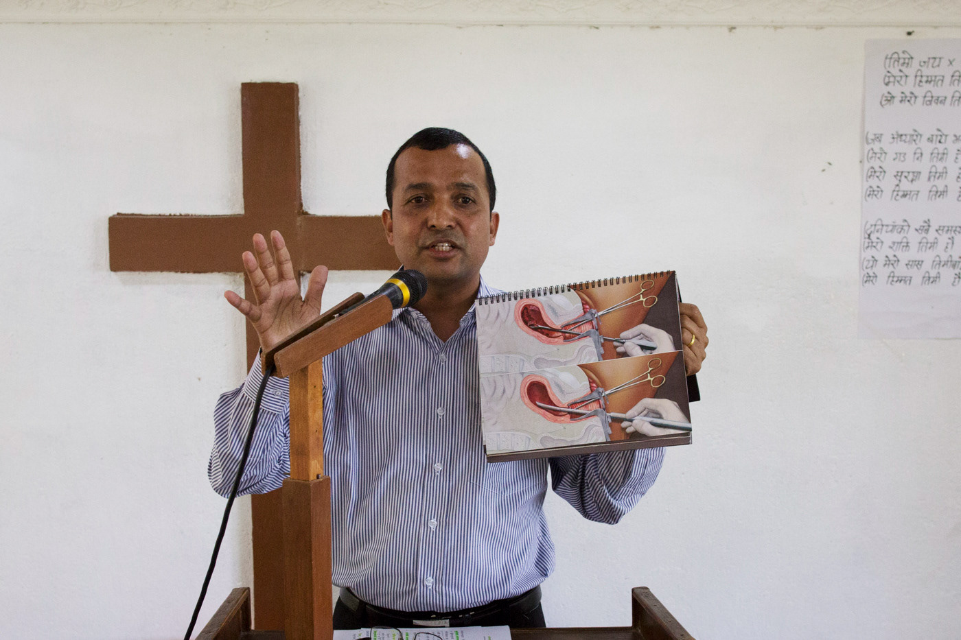 Soman Rai, a pastor who founded the non-profit Voice of Fetus Nepal, gives a presentation about why women shouldn't have abortions because it is killing a fetus, at a small church in the village of Shilaprabat, Sindhupalcholk district, Nepal, July 14, 2017. (Photo Credit/Tara Todras-Whitehill/European Journalism Centre/Vignette Interactive)