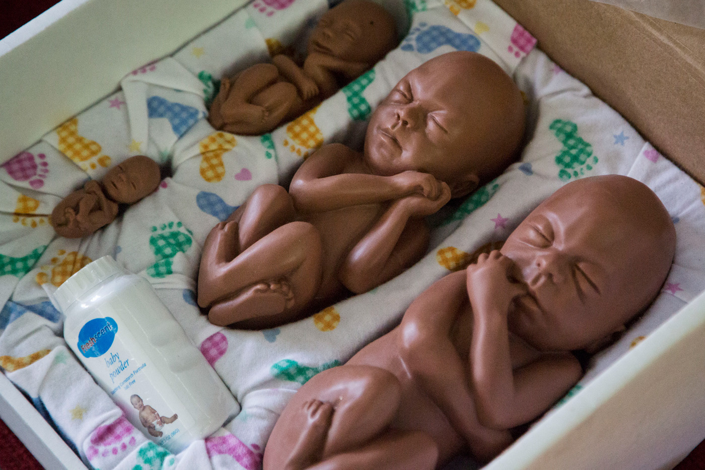 Models of fetuses that are supposed to show different stages of pregnancy are seen during a lecture of Soman Rai, a pastor who founded the non-profit Voice of Fetus Nepal at a small church in the village of Shilaprabat, Sindhupalcholk district, Nepal, July 14, 2017. (Photo Credit/Tara Todras-Whitehill/European Journalism Centre/Vignette Interactive)