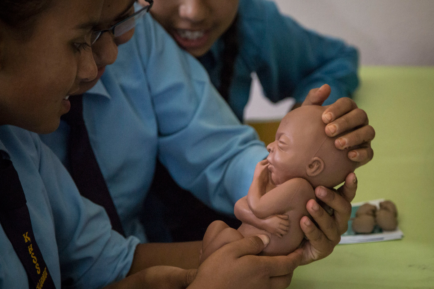 Students pass around a model of a fetus during a lecture by Soman Rai, a pastor who founded the non-profit Voice of Fetus Nepal, after a presentation about abstinence, falling in love and why women shouldn't have abortions because it is killing a fetus, at the Shree Kalinchwok secondary school in Dolakha, Nepal, July 17, 2017. (Photo Credit/Tara Todras-Whitehill/European Journalism Centre/Vignette Interactive)