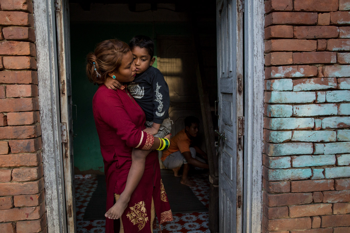 Niru Tamil, age 23, left, kisses her son Samuel, age 7, as her husband is seen in the background, at their house in a village near Kathmandu, Nepal, July 13, 2017. (Photo Credit/Tara Todras-Whitehill/European Journalism Centre/Vignette Interactive)