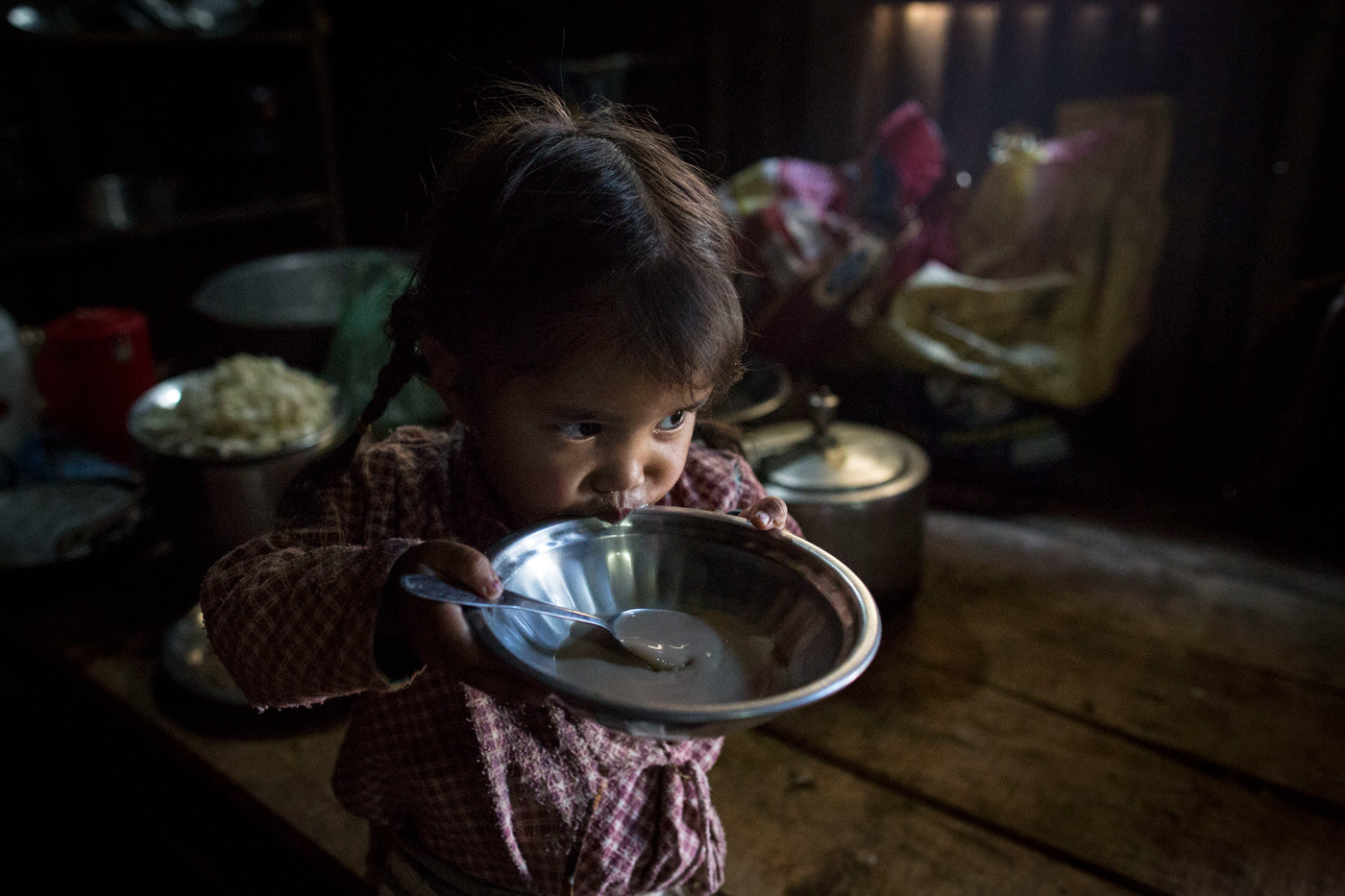 Sofiya Thami, age 3, eats some porridge inside her family's small shack, where she, her parents Reshu and Ranjan, and her seven other siblings live in Dolakha, Nepal, July 16, 2017. (Photo Credit/Tara Todras-Whitehill/European Journalism Centre/Vignette Interactive)